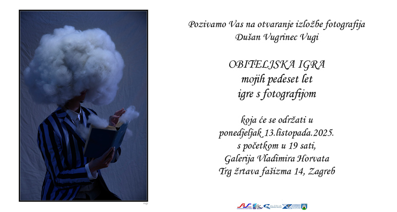 Pozivamo vas na otvaranje izložbe fotografija Dušana Vugrinca Vugija “Obiteljska igra – mojih pedeset let igrre s fotografijom” koja će održati u ponedjeljak 13. listopada 2025. godine s početkom u 19 sati u Galeriji Vladimira Horvata, Trg žrtava fašizma 14 u Zagrebu.